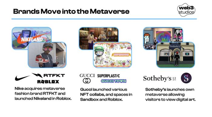 - 商家和创作者的巨大机会——耐克收购了 RTFKT、阿迪达斯收购了 NDFKT、微软购买动视。