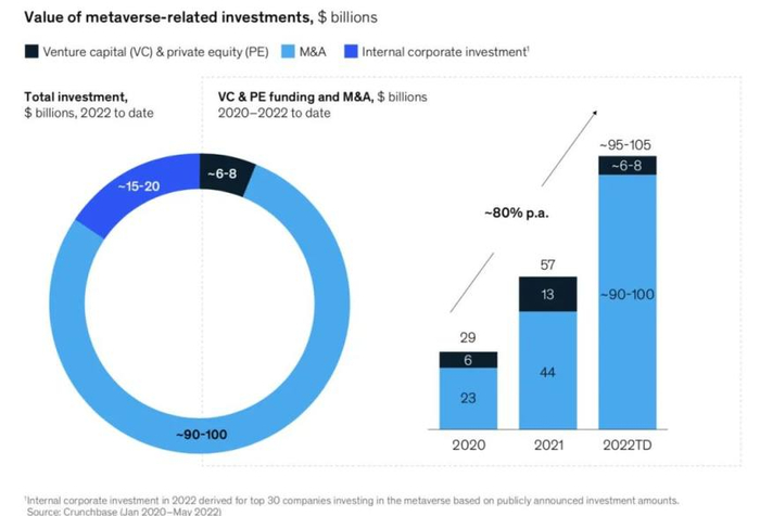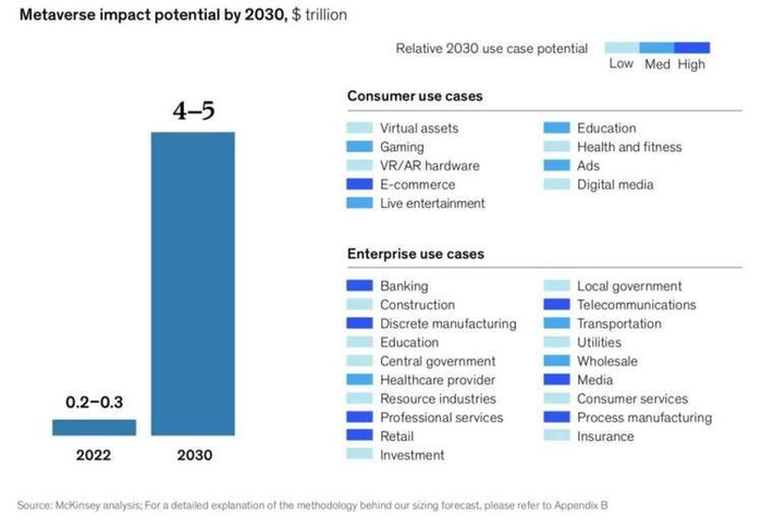 虽然其他人认为这是一个更大的市场 ( 例如,花旗公司认为 2030 年的元宇宙市场规模为 8-13 万亿美元 ),但麦肯锡估计 2030 年的元宇宙市场规模为 4-5 万亿美元: