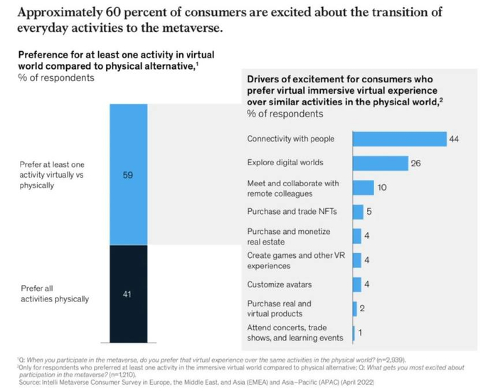 当麦肯锡询问消费者在未来五年内希望在元宇宙做什么时,与家人和朋友的社交和沟通排名最高: