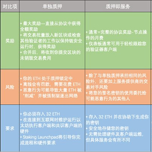 截至目前,除了向信标链单独质押外,诸多为以太坊提供质押的第三方服务模式已经出现,包括质押即服务、集合质押池、中心化交易所提供的质押服务。以太坊官网也列出了采用去中心化质押服务时的风险、回报和要求。