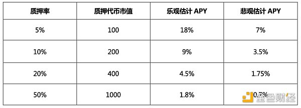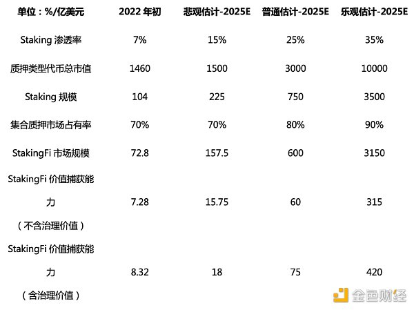 到 2025 年,预计 Staking 年奖励达到 400 亿美元,平均 Staking 收益率在 5%-10% 之间,这意味着总的质押代币市值将在 4000 亿 -8000 亿美元之间。 即使假设渗透率没有增加,2021-2025 年的年增长率也可以在 17%-40%