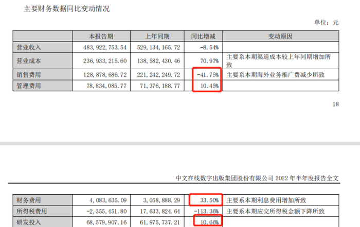 开源有限的情况下,上半年中文在线的费用开支却不见减少。报告期内公司的管理费用、财务费用、研发投入同比分别增加10.45%、33.5%、10.66%,营业成本也大幅增长70.97%。只有销售费用同比减少41.75%至1.29亿元,主要系期内海外业务推广费用减少。