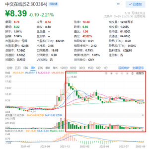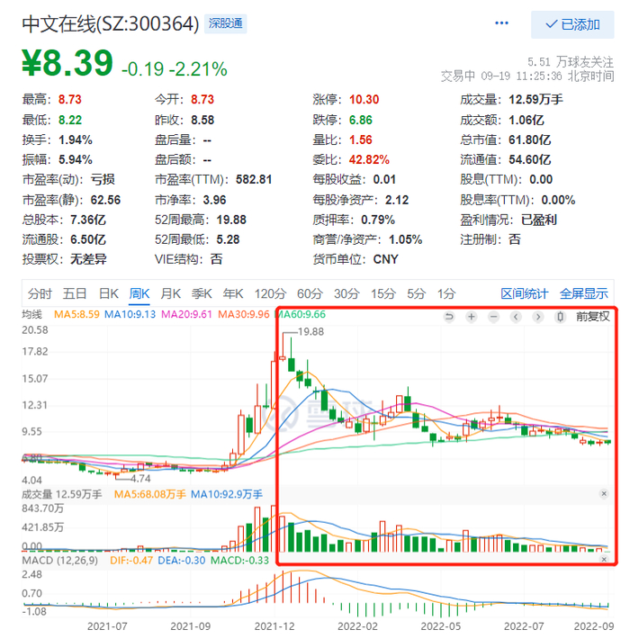 然而一顿操作之后,资本市场却没有买账。在频追元宇宙热点的去年11月,中文在线股价一度上涨,最高曾升至19.88元/股,但随后却整体走低。截至2022年9月13日,公司股价报收8.34元/股,与最高点相比已经跌去58.05%。