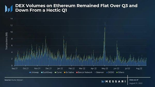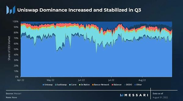 在第二季度,DEX的日均交易量为27.8亿美元。在第三季度,这一数字降至18.3亿美元。年环比销量也降至约8亿美元。Uniswap的主导地位从第二季度末的60%上升到8月底的72%。Uniswap在整个第三季度的市场份额一直保持在DEX的75%左右。值得注意的是,尽管Curve继续推出了高于竞争对手的激励措施,但其市场份额却从16%下降至8%。