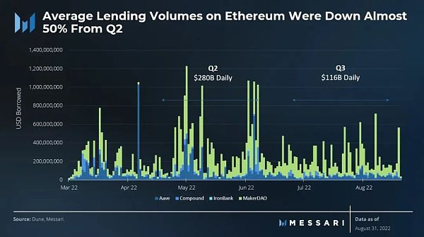 第三季度平均贷款规模大幅下降。日均交易额从第二季度的2800亿美元降至1160亿美元。7月交易量明显放缓,但在8月略有回升,因为希望获得ETH POW空投的个人对现货ETH的需求有所增加。