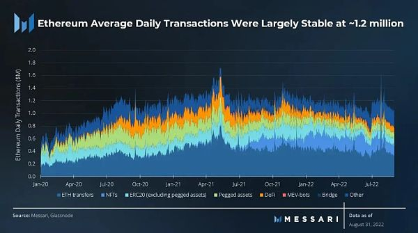 活动地址自然也遵循了与交易类似的模式。本季度的日活跃地址为55万,比上一季度增长了5%。增长的主要原因是2022年7月27日活跃地址的激增,当时著名的以太坊矿工Chandler Guo宣布了以太坊PoW分叉的计划,以及币安的一些钱包“维护活动”。最重要的是,这些活动很可能不是因为有新的用户涌入,也不是因为有新的应用。