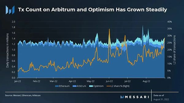以太坊以rollup为中心的扩展计划终于实现了。虽然以太坊的平均交易数可能仍保持在区间内,但L2交易有了显著增长。Arbitrum上的平均交易量几乎增长了三倍,从2022年1月的3.9万笔增至2022年8月的11.5万笔。在同一时期,Optimism的交易量也从4.1万笔增加到14.2万笔,增长了近3.5倍。
