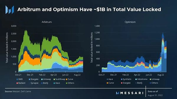 新兴的底层生态系统正在推动L2的活动。L2应用已经吸引了真正的使用和关注,即Arbitrum的GMX和Optimism的Synthetix。这些应用也是其各自平台上TVL的最大驱动力之一。