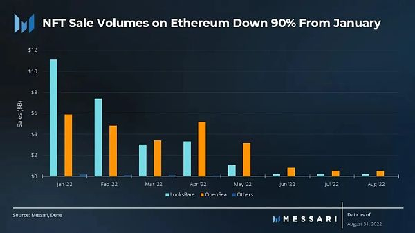 尽管NFT日均交易量大幅下降,但日均交易者数量的降幅要小得多。这表明用户粘性基础在每天4万左右。以美元计算的交易量较1月份下降了90%。第三季度平均每月销售额不足10亿美元,而第二季度为46亿美元。这种下降不仅与NFT市场放缓有关,还与大多数NFT使用的基础货币ETH的价格下跌有关。OpenSea在第三季度继续主导着市场份额。