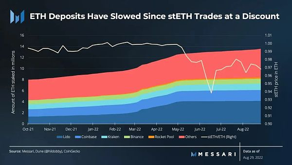 在这两个月的时间里,向信标链的资金流入明显放缓,仅增长了4%,而第二季度增长了17%。这种低增长的主要原因是,最大的质押衍生品——Lido的stETH目前的交易价格低于现货ETH。只要贬值仍然存在,用户通过在二级市场上购买stETH获得的质押敞口将会比直接在以太坊上投资获得更多利润。在大型中心化质押提供商中,Coinbase和币安都增长了4%,尽管它们的质押衍生品cbETH和BETH的交易价格也低于ETH。在流动性质押衍生品中,Lido增长了1%,达到了420万ETH的质押,Rocket Pool增长了11%,达到了21.8万ETH质押。
