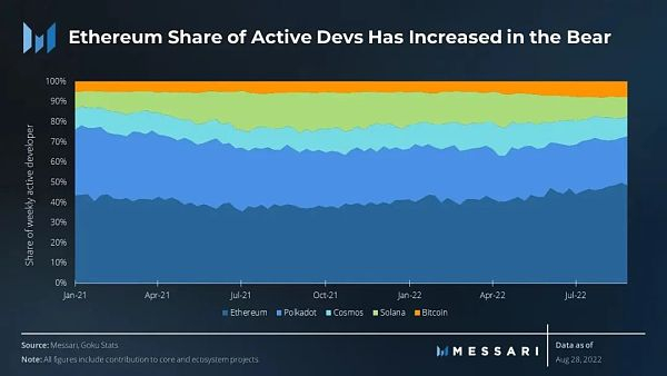 以太坊生态系统的关键护城河在于其繁荣的开发者景观和其虚拟机在整个加密货币中的主导地位。其生态系统拥有的每周活跃开发者数量几乎与排在其后的四大生态系统的总和一样多。在熊市中,以太坊的开发活动比其他生态系统更好地支撑了下来,其份额比去年增加了10%。