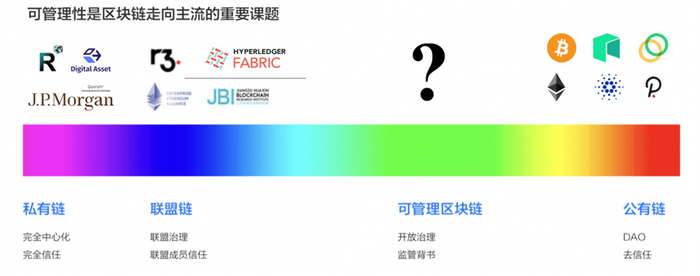 而从区块链的形态来看,我们可以根据去中心化程度、准入方式、生态应用等维度将分布式账本协议简单地分为:私有链、联盟链、可管理区块链、公有链。去年我曾提出,区块链的分类标准是一个光谱,具体形态随着生态的开放程度而变化。而“可管理性区块链”可能是两种形态的中间地带。自然地人们会认为偏向左侧的更接近Web2,偏向右侧更接近Web3。