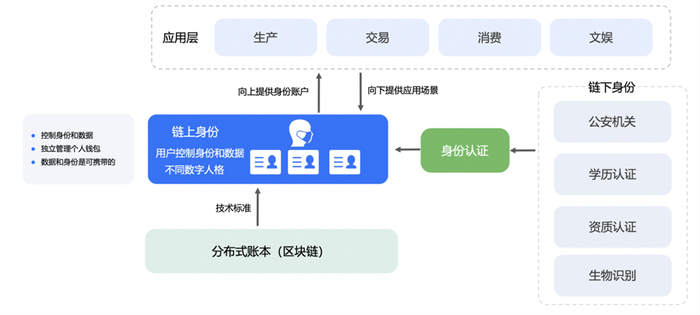可以让用户拥有控制自己身份的数据,代入到不同数字人格中去。这些数据又可以通过链下认证机构进行认证,比如公安机关可以对身份证信息进行认证,学历可以由学术机构认证,职业能力由职业资质机构认证,也可以结合生物识别的方法,用户就拥有了虚拟线上的数字人格。当你需要向别人证明的时候,你又可以证明我背后是实实在在的人。 这些链上身份向上层的应用生产、消费、文娱等各环节的应用提供了身份账户,这些上层应用向下层链上身份提供各式各样的应用场景,这些身份会变成一个海洋般的用户账户池,任何上层应用只要服务够好,都可以在下层获得更真正的用户,而不会像今天的阿里系或者腾讯系的用户其实是一个封闭系统,你在阿里的用户账户不能带去其他地方。而这是用户自己控制的链上身份。