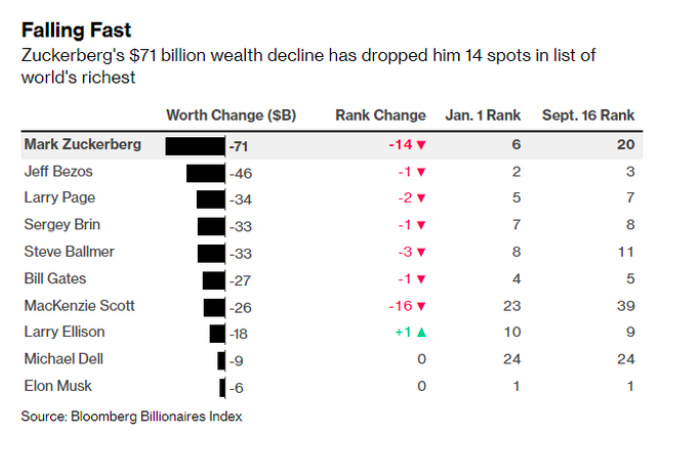 槽糕的财报和艰难的转型,让扎克伯格的的身价大幅缩水。彭博亿万富翁指数显示,截至9月20日,扎克伯格身家为559亿美元,在全球亿万富翁中的排名从年初的第6位下滑至第20位,创下自2014年以来最低排名。2022年以来,扎克伯格的身家已缩水710亿美元(约合人民币4979亿元)。