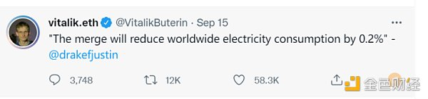 除此之外,合并以后以太坊的能源消耗降低了将近 99.95%,据 Vitalik Buterin 推文,以太坊合并将使全球用电量减少 0.2%。