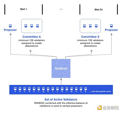 Epoch 开始的时候,通过 RANDAO 为每一个 Slot(时隙)分配一个 Committee(验证者委员会)对上一个 Epoch 进行 Attestation(签名投票)。