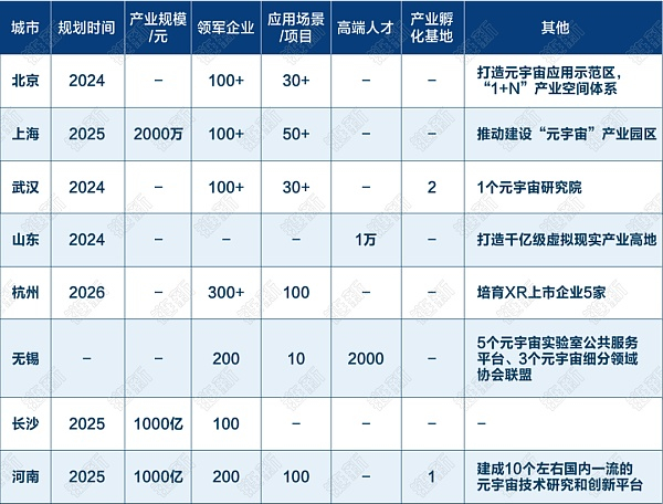 湖南长沙和湖南省也分别提出了1000亿元的产业规模目标。《河南省元宇宙产业发展行动计划(2022-2025年)》提出,到2025年,全省元宇宙产业核心产业规模超过300亿元,带动相关产业规模超过1000亿元。