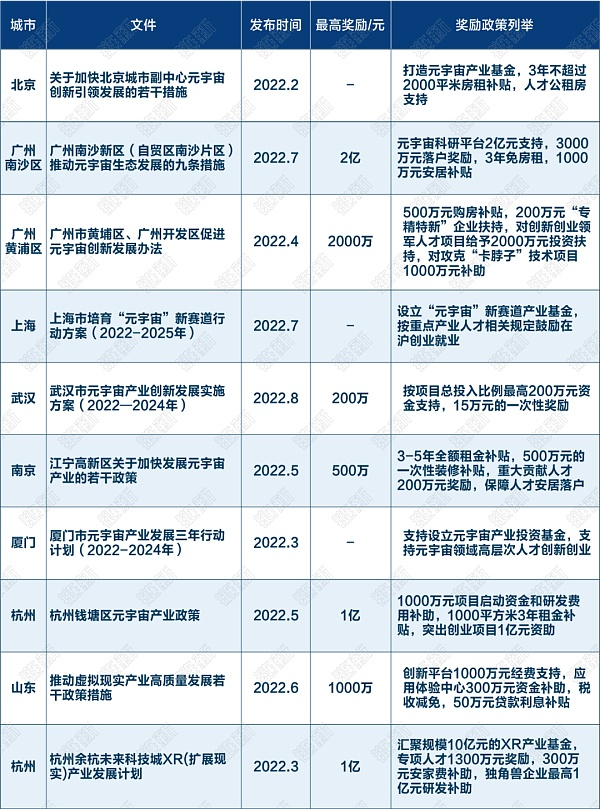 目前,给出最高奖励金额的是广州南沙区,为2亿元。2022年7月发布的《广州南沙新区(自贸区南沙片区)推动元宇宙生态发展的九条措施》提到,对具有重大科技创新支撑作用的元宇宙科研平台落地,给予每个平台最高2亿元资金支持。对经省、市科技主管部门认定的元宇宙领域新型研发机构在建设期内给予最高1亿元补助。