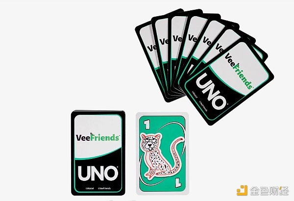 美泰的VeeFriends UNO牌组具有VeeFriends的标志性角色和NFT特色(右图是对应的史诗稀有Charming Cheetah)。