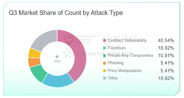 第三季度,合约漏洞利用依然是最常见的攻击手法。约有15起攻击事件源于合约漏洞利用,占总数量的40.5%。