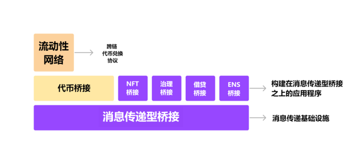 - 基于消息传递的代币桥接 —— 这些桥接能让流动性以消息传递的形式跨链流动。一般,它们允许一笔资产在来源链上锁定或销毁后,在目标链上铸造出来。例子:Rollup 桥接、Polygon 原生桥接、Anyswap(anyCall)和 Axelar 网络。
