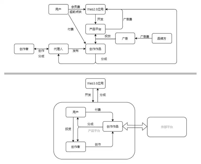 例如 Twitter 和微博的广告帖,YouTube 的视频广告分成,TikTok 的广告植入等。其实该体系已经有 Web3.0 的影子在其中了,不过大部分平台都依仗自身平台优势挤压平台创作者的分配比例。对于会员制这种提前付费来获得服务的方式来说,Web3.0 应用也有采用,但是 Web2.0 却选择牺牲用户体验而上线所谓会员专属广告和会员超前点映等,违背当初会员机制承诺,吃相十分难看。