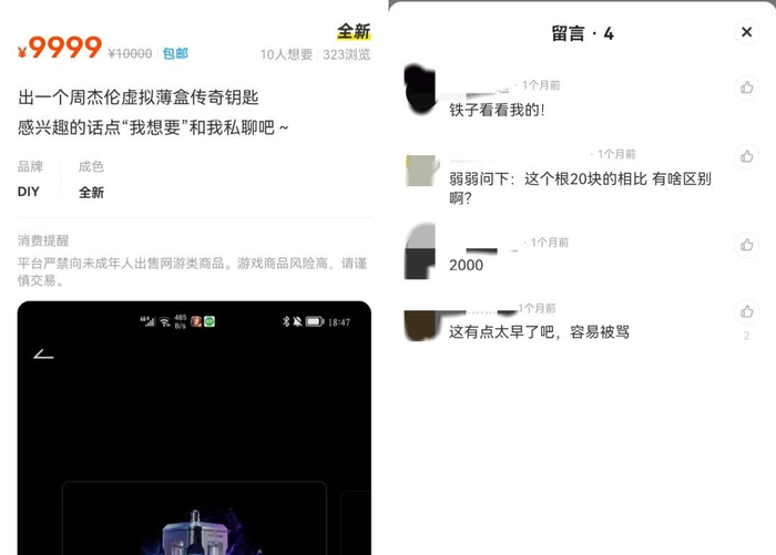 在一些二手交易平台上,周杰伦Demo空间开出的稀有钥匙和传奇钥匙被标上了9999元甚至20000元的价格,但留言的买家表示愿意出2000元,还有买家表示“和20块的有什么区别吗”。罗夏也表示,周杰伦的数字藏品目前是“有价无市”,反而是盲盒附赠的实体周边还有粉丝购买收藏。