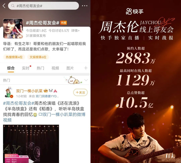 名字中带有几分中二的“哥”让不少粉丝直呼是“周董熟悉的味道”,而当直播间熟悉的《半岛铁盒》节奏响起,直播间瞬间被“爷青回”刷屏,也成功为快手夺得了全网的关注:超2800万人预约,点赞破10.5亿,直播最高在线人数1129万人,微博相关话题阅读量超过1.8亿。
