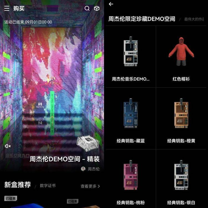 “Demo空间”类似一个可互动的3D游戏,购买者用数字人形象进入虚拟空间,边听Demo边挖彩蛋。发售模式上,借鉴了盲盒形式,分为20元的普通盲盒以及499元的限量盲盒,20元的盲盒每个用户限购30个,含有一把随机钥匙,而499元的盲盒限购2个,其中包含两把钥匙,一把是经典钥匙,另一把则是随机的稀有钥匙或者传奇钥匙。