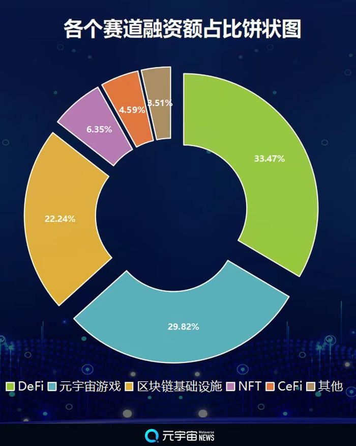 从细分赛道来看,去中心化金融DeFi领域有11个项目获得2.42亿美元融资,成为融资总额最多的领域。此外,元宇宙游戏赛道获得融资的项目数量最多。