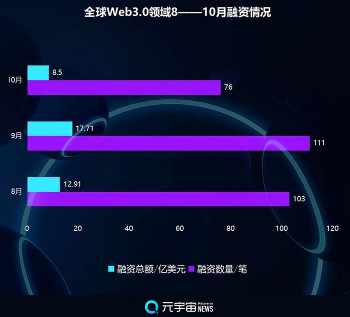 据财联社创投通不完全统计,10月份全球Web3.0领域融资总数量为76笔,环比下降31.51%;融资总额为8.5亿美元,环比下降52%。