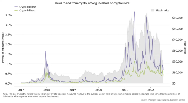 新手们似乎在判断何时买入方面相当糟糕,卖出的时机似乎也好不到哪里去——加密资产流出的高峰几乎完美错过了价格的最高点。