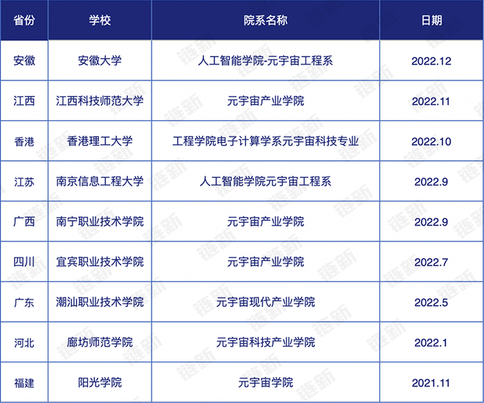其中,南京信息工程大学和江西科技师范大学的元宇宙相关院系是改名而来。