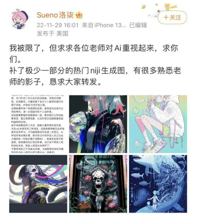 11月29日,插画博主洛柒投诉AI绘画的微博也引发热议。洛柒指出,AI绘画软件Nijijourney生成的许多图片风格,与一些画师的作品高度相似,更有一些图片下方直接带上了这些画师的签名和水印,“(AI作品)有很多我熟悉的老师的画作”“求求各位老师对AI重视起来”,洛柒呼吁道。
