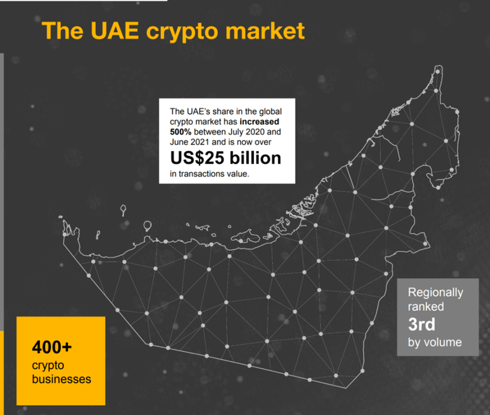 根据 PWC 的一份报告显示,在 2020 年 7 月至 2021 年 6 月期间,阿联酋在全球加密货币市场的份额增加了 500%,早已超过了 250 亿美元的交易额。