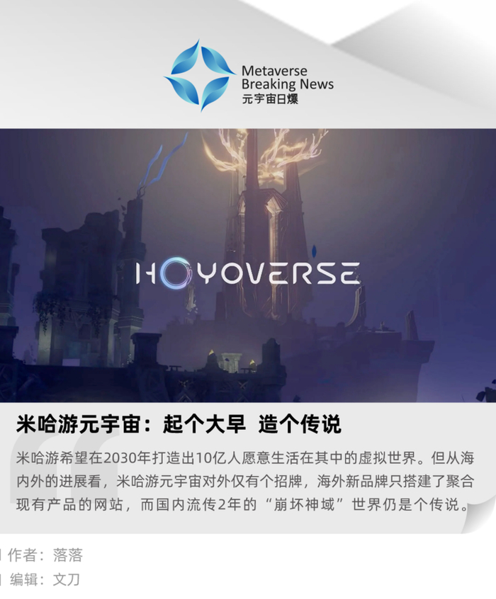 米哈游当然也看到了元宇宙的风口,它已经创立了连国际科技媒体都关注到的元宇宙新品牌——HoYoverse。去年2月,米哈游公告表示,HoYoverse 的使命是“创造一个以内容为导向的广泛虚拟世界”,将为玩家融合游戏、动漫和其他多种娱乐类型。7月,HoYoverse在新加坡设立总部。