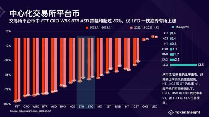 2022 年几乎所有的交易所平台币都遭受了重大损失。FTT、CRO、WRX、BTR 和 ASD 价格都下跌超过 80% ,而 LEO 和 OKB 表现相对强势。