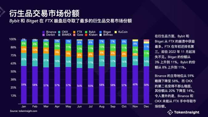 2022 年最大的赢家 Binance 在 2022 年全年过后新增了近 20% 的市场份额,从年初的不到 50% 提高到年底的近 65% 。Bybit 的份额增长紧随其后,增加了 5.4% 。