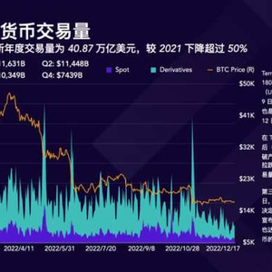 2022 全年,排名前 10 中心化交易所总交易量(现货 + 衍生品)达到 40.87 万亿美元,相比于 2021 年,下降了超 50% 。全年共计三次日交易高峰,分别发生于 5 月, 6 月和 11 月。