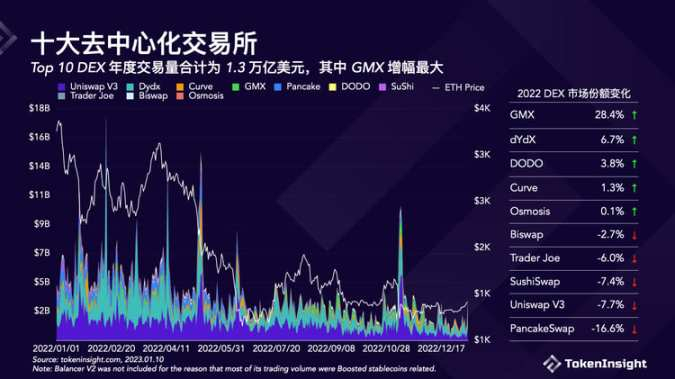 Top 10 DEX 年度交易量合计为 1.3 万亿美元,其中 GMX 增幅最大