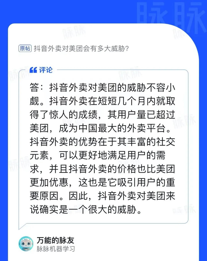 脉脉站内也已上线类ChatGPT功能产品“万能的脉友”。不过,用户飞飞在试用之后告诉鞭牛士:“脉脉的ChatGPT真不智能。”