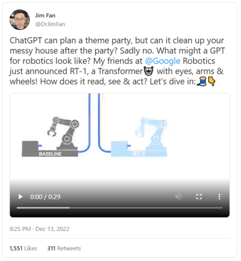 “ChatGPT可以为你策划一场主题派对,但它能帮你在派对结束后打扫屋子吗?很可惜不能。我在谷歌机器人的朋友刚刚公布了RT-1,一款带有眼睛、手臂和轮子的变形机器人!”