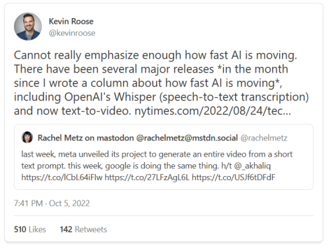 这些技术进步彼此追赶的速度令人印象深刻,正如Kevin Roose等人所评论的那样:“AI的发展速度如此惊人,怎么强调都不为过。我刚写完一篇关于AI惊人发展速度的文章,市场上就有了一些重大发布,包括OpenAI的Whisper(语音到文字的转录软件)和文字到视频的生成软件。”
