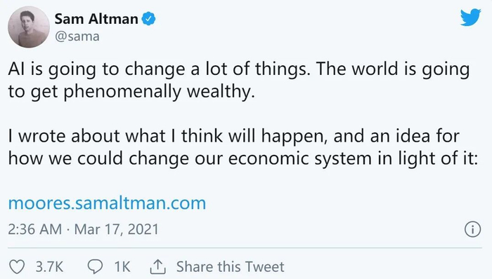 在这篇公开发表文章中,Sam Altman写道,这场技术革命势不可挡。一旦足够强大的人工智能「加入劳动力大军」,许多种类的劳动力(驱动商品和服务成本)的价格将降至零。这场革命将创造惊人的财富,以至于每个成年美国人,从现在开始的10年之内,每年都能从其意外之财中获得$ 13,500的报酬。(几年前,马斯克也有过类似暗示。)