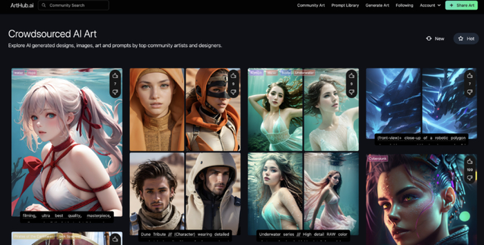 Arthub.ai 是一个展示、发现和创造 AI 生成艺术的创意社区,你可以在该平台探索 AI 生成的设计、图像、艺术和顶级社区艺术家和设计师的 prompt。Arthub.ai 构建了一个 prompt 库,可以按照图像类别查看生成的 AI 绘画,例如建筑、时尚、珠宝、logo等等,图像的详细页面展示了生成该图像的 prompt,你同样可以使用这些 prompt 在该平台进行二次生成。Arthub.ai 目前使用的 AI 生成模型比较单一,仅 Stable Diffusion 可用。