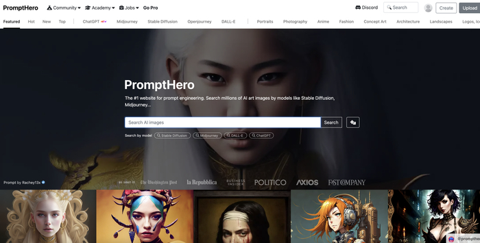 除了按模型搜索,PromptHero 还提供按图像类别搜索,如肖像、二次元、时尚、建筑、摄影等,这些图像都是来自 Stable Diffusion, DALL-E, Midjourney 等 AI 图像生成模型的“最佳(Best)”结果,每一个结果都有极高的精细程度。