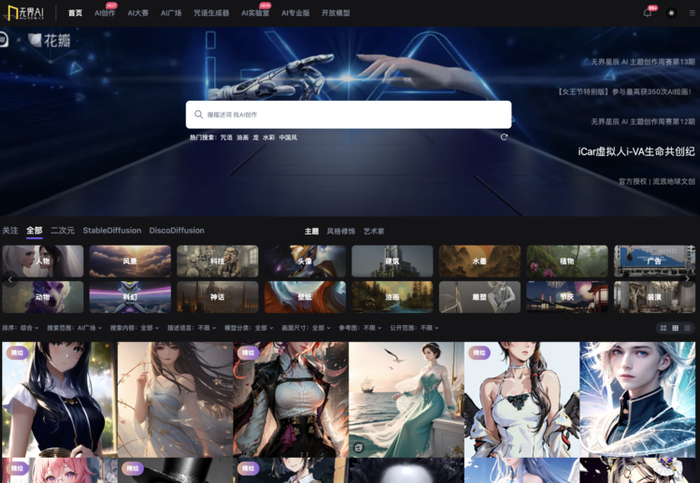 无界 AI 是一个国产 AI 绘画平台,具有很强的本土特征,根据国内用户习惯进行打造,是目前国产功能最强大的 AI 绘画平台。平台提供了数十种主题模型以及上百种绘画风格,为用户进行创作提供了很高的选择性。该平台提供的 prompt 非常丰富,不过 prompt 一词在该平台被本土化为“咒语”,更为贴切。在咒语生成器页面,用户可以查看一些常用的咒语,同时还可以进行搜索,选择自己想要的咒语进行编辑并创作生成绘画。