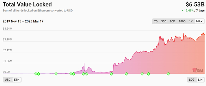 Layer2从提出以来,生态持续稳步发展。下图显示,以Eth本位计算,2019.11.15-2023.3.17,Layer2总锁仓量(TVL)的趋势。