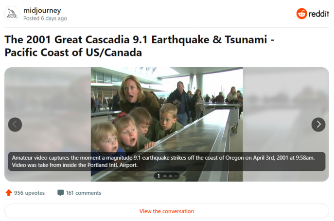 ,声称它们描绘了“2001 年卡斯卡迪亚 9.1 大地震和海啸”,袭击了美国和加拿大。在 reddit 的这个版块里,我们致力于用 Midjourney 的人工智能工具进行实验,很明显,卡斯卡迪亚大地震并不是一个真实的事件。但是,如果 r/Midjourney 只是你订阅的众多子 reddits 中的一个,你就很容易不加思索地消费这些图片。