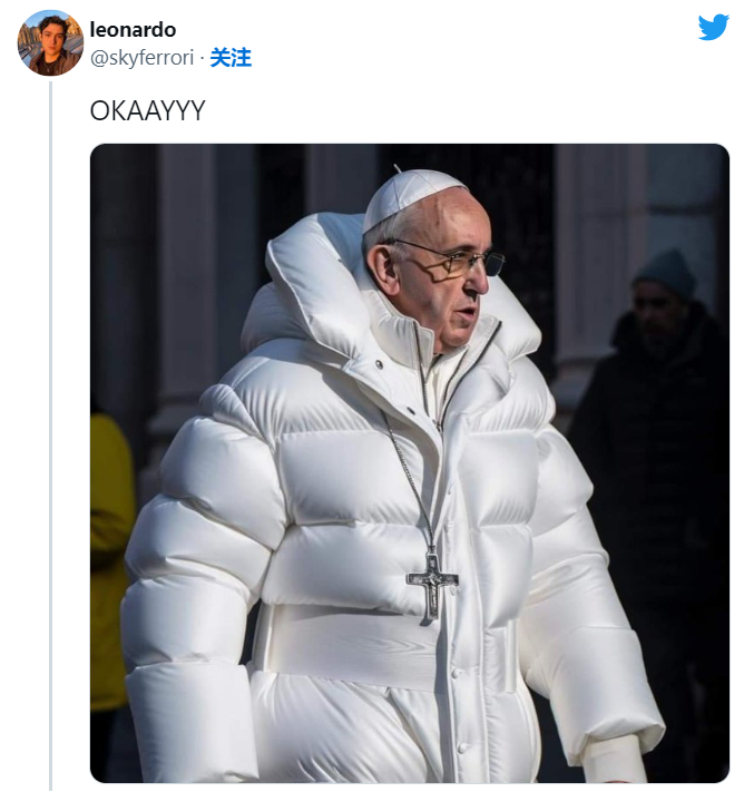 甚至连超级名模 Chrissy Teigen 也被这对这组图像信以为真。她在推特上称:“我以为教皇的羽绒服是真的,没有多想。”“我不可能在未来的技术中生存。”